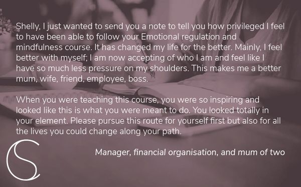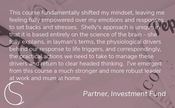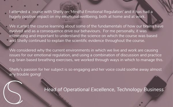 Shelly regularly runs a high-impact nine-week course called The Neuroscience of Emotional Regulation, Resilience and Wellbeing both for organisations and individuals. She has run it for a varied group of corporate firms including private equity, technology, pharmaceutical, recruitment and also for parents and individuals.